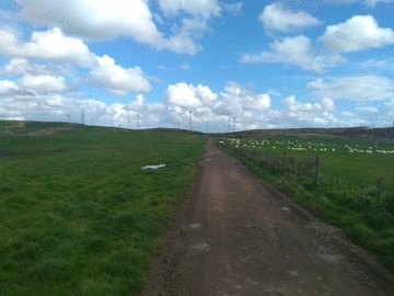 After the next road crossing we were now on ground new to me, a Forestry sign that I had passed before was the last known landmark (until Perth). From looking at the map this looked like fairly dull field-side running, particularly from CP3 to CP4, but I rather enjoyed some forestry tracks and then more paths than expected. Even the wind farm was enjoyable to approach.